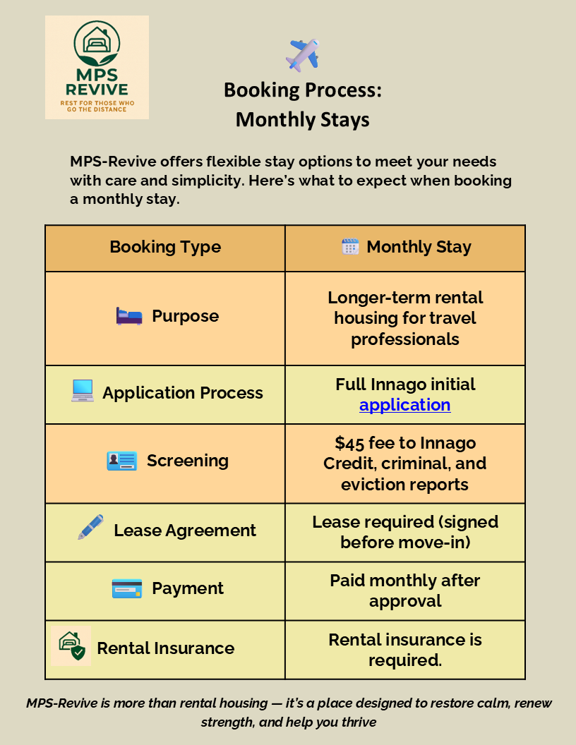 Travel professionals know constant change — new contracts, new cities, unfamiliar housing. Hotels are costly; short-term rentals unpredictable. At MPS-Revive, we know what you need most: consistency and care.