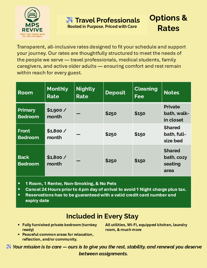 Our rates are thoughtfully structured to meet the needs of the people we serve — travel professionals, medical students, family caregivers, and active older adults — ensuring comfort and rest remain within reach for every guest.
